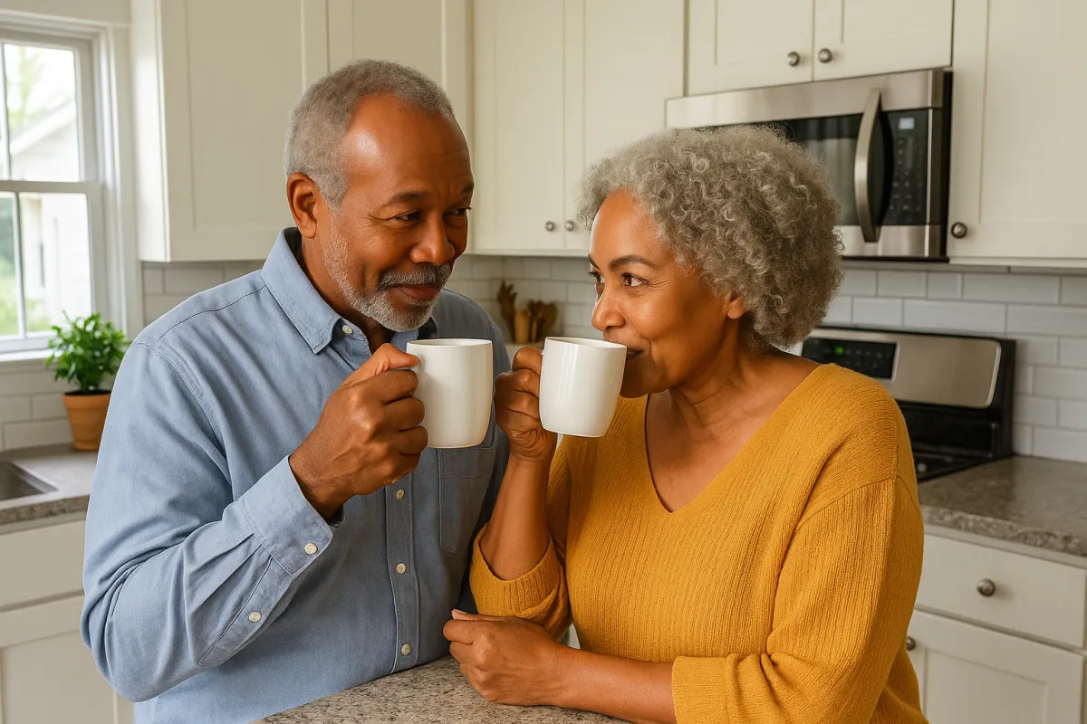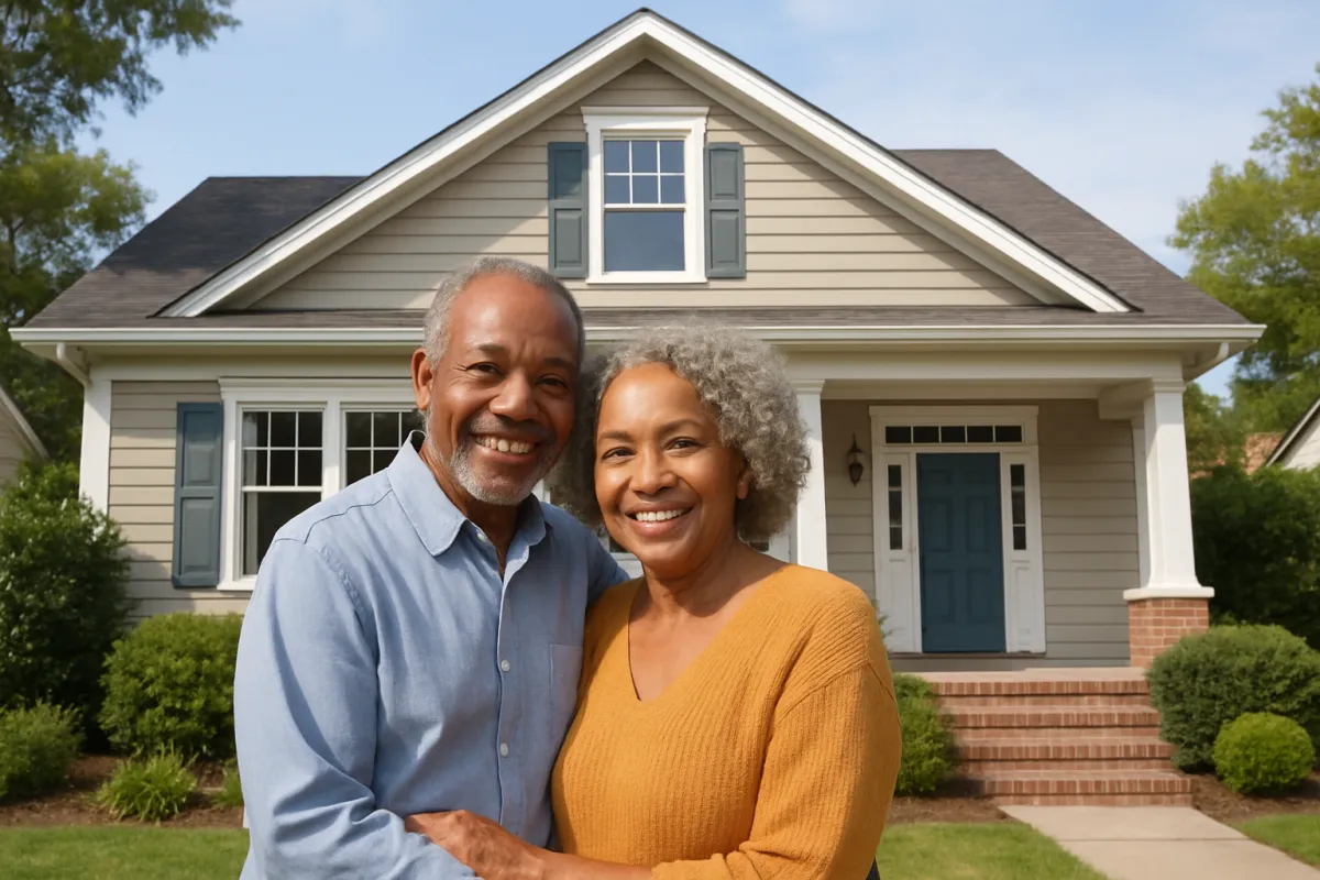 Image generated using the following prompt: Create a realistic magazine image of a couple in their 60s standing happily in front of a house, with the house as a focal point.